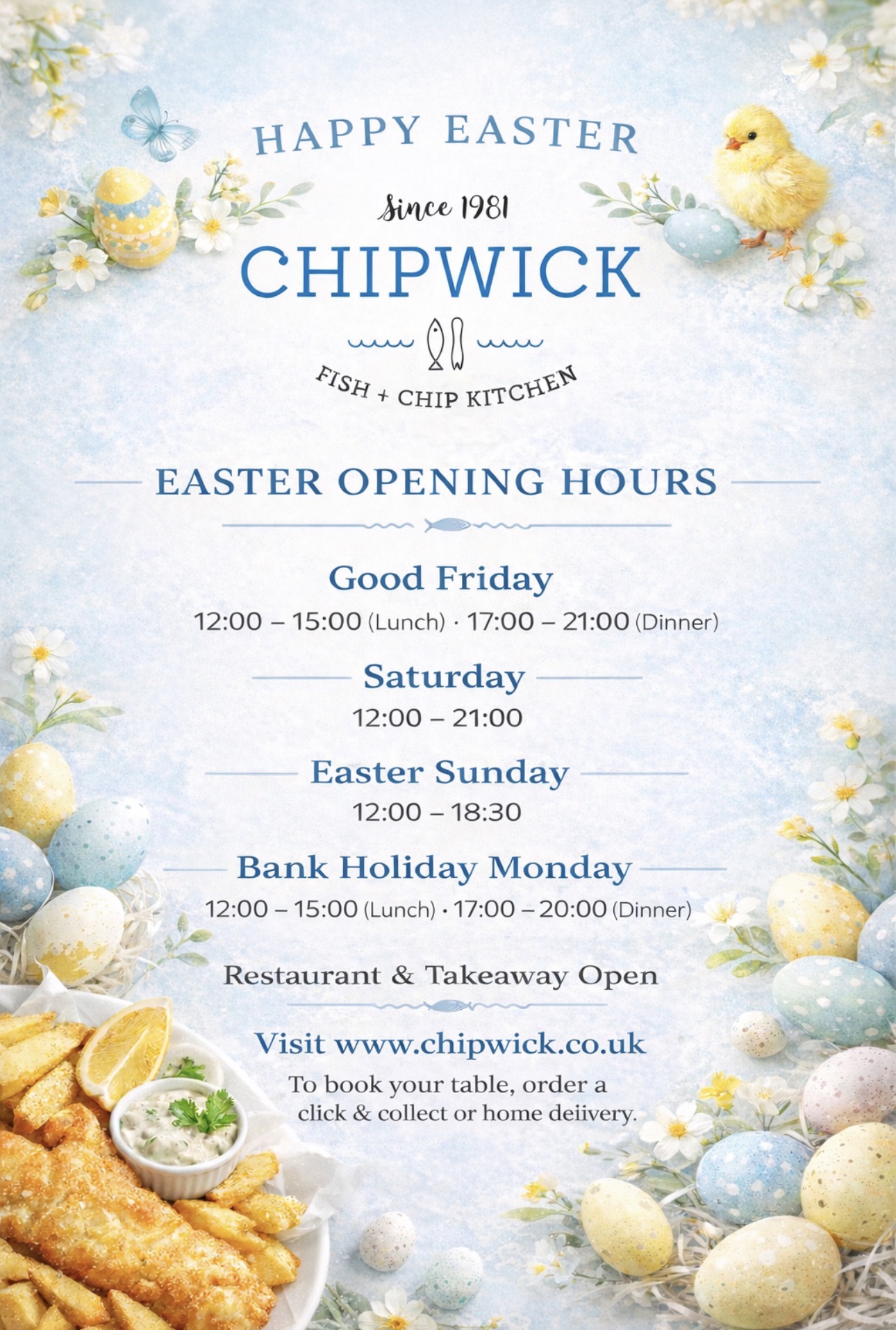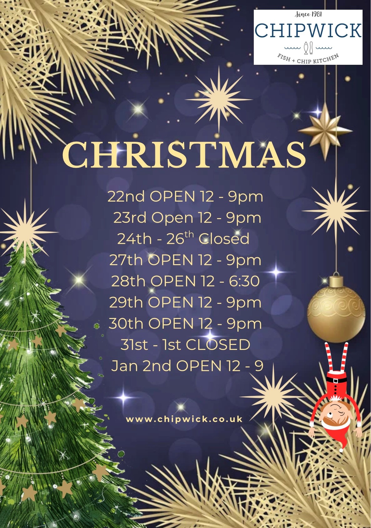 Welcome to Chipwick’s family run award-winning fish and chip restaurant and takeaway. Our fully licensed restaurant with a comfortable & relaxed atmosphere is perfect for couples, family & friends. Click the link above to secure your table and come and enjoy our fantastic food & service. We now offer a home delivery service & click and collect. Do download our app to receive monthly offers on your favorite food.
